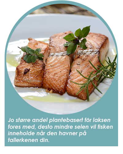 Det plantebaserte fôret får oppdrettslaks til å vokse til normal størrelse, men det er allikevel en stor ulempe med dette skal vi tro nyere forskning. Faktum er at jo større andel plantebasert fôr laksen fores med, desto mindre selen vil fisken inneholde når den havner på tallerkenen din. Dette viser et studie utført av forskere i Storbritannia, publisert i British Journal of Nutrition * 2016. Studiet viser at laksen avlet frem med minimum mengder marint fôr inneholdt halvparten så mye selen som laksen med den høyeste andelen marin næring.